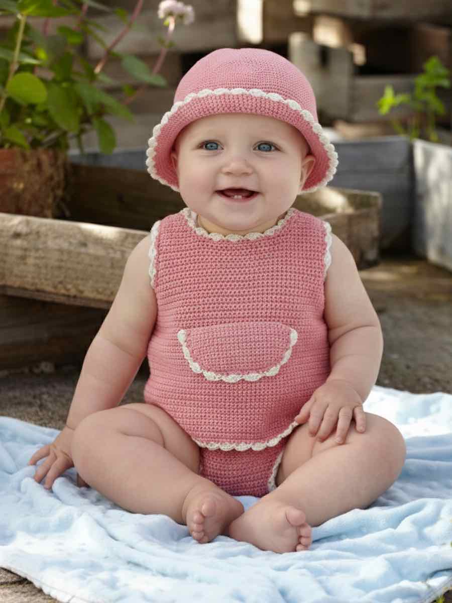 Det hæklede babysæt består af en top, bukser og hue i merceriseret bomuld. Delene er hæklet i fastmasker og stangmasker med dekorative kappekanter. Toppen er formet med udtagninger og en knappestolpe bagpå, bukserne har elastik i taljen, og huen er hæklet rundt fra toppen.