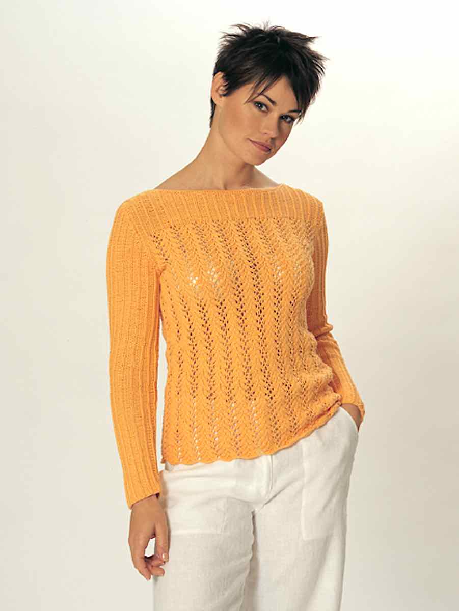 Strik en blondetrøje i bomuldsgarn med hulmønster efter diagrammet. For- og bagstykket strikkes separat med udtagninger, indtagninger og halsudskæring, ærmerne i hel blonde. Afslut med retstrik i halsudskæringen og montering for en luftig og elegant sweater!