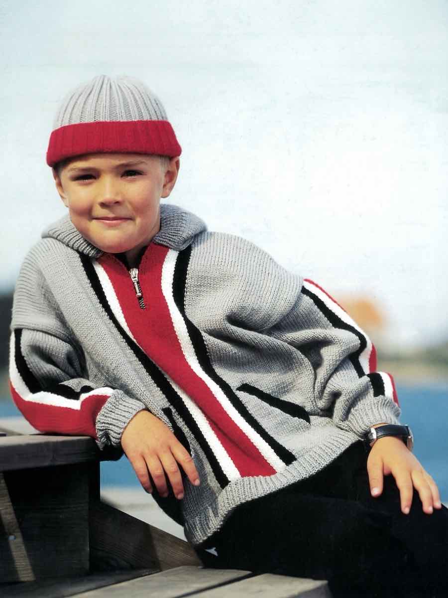 Børnetrøjen strikkes i rib og glatstrik med farveskift efter mønsteret. Form hals og ærmer med indtagninger. Saml delene, sy sammen og sæt lynlåsen i. Huen strikkes rundt i de samme farver.