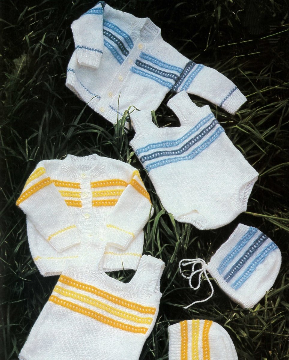Sæt i tre dele, der er strikket på traditionel vis og syet sammen.
