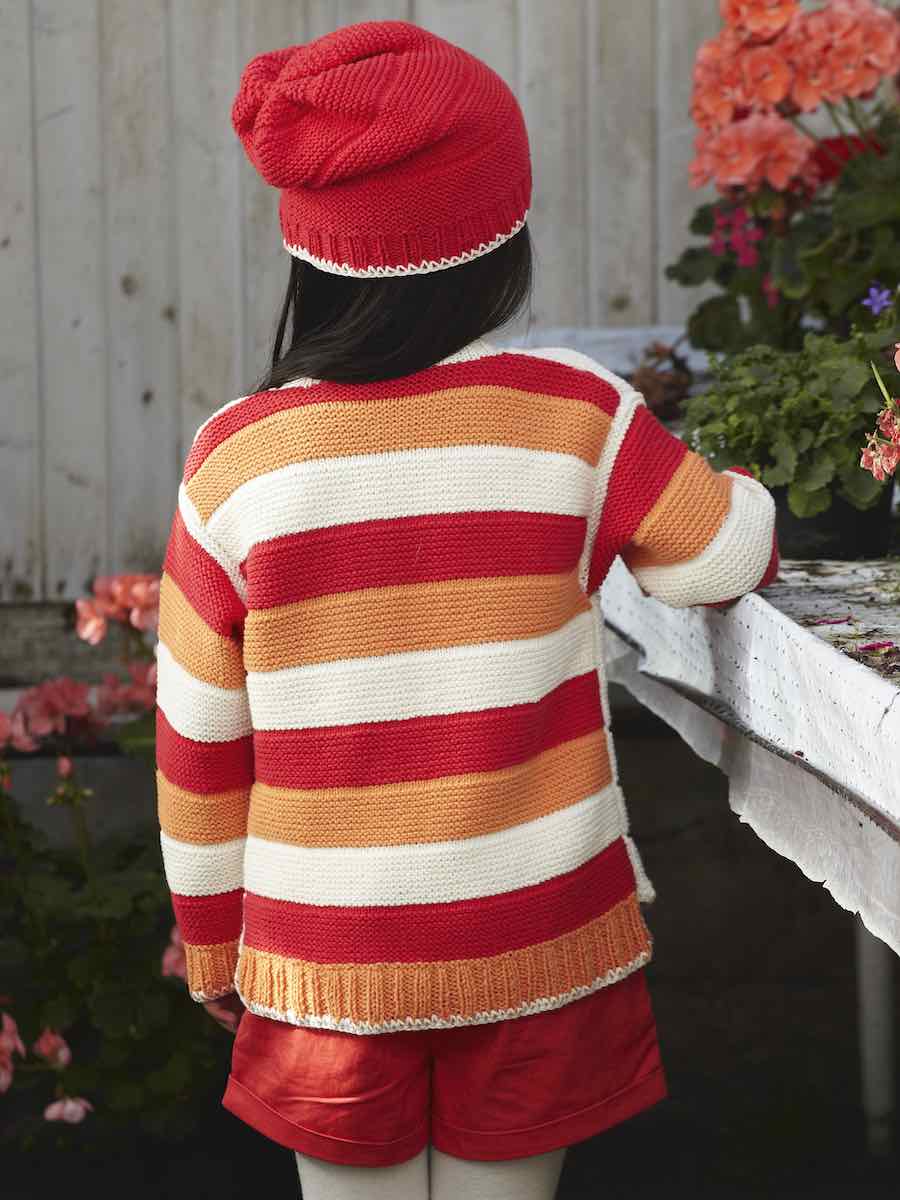 Strik en pigecardigan i bomuld med retstrik og elastik. Delene strikkes separat med en knaplukning foran. Huen matcher og hækles rundt. Samles med hæklede kanter og knapper.