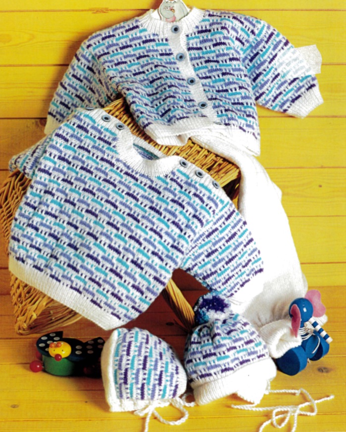 Tilbehør: Cardigan med 5 knapper. Strik med 6 knapper. Elastik til bukserne.