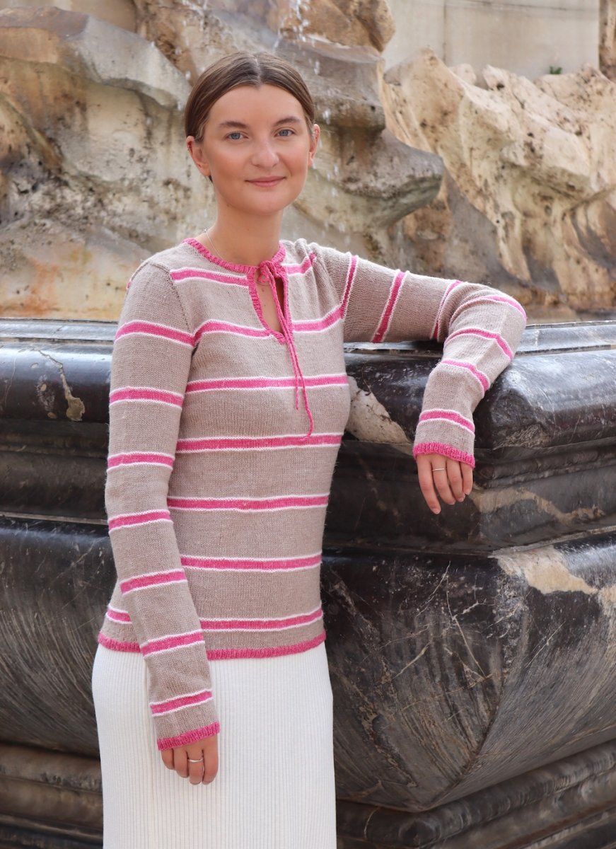 Damesweater strikket nedefra og op på rund strikkepinde op til ærmegabet. Sweateren har et indsyet ærme. Halsudskæringen og slidsen udgør en sjov detalje, der slutter med to snoede snore.