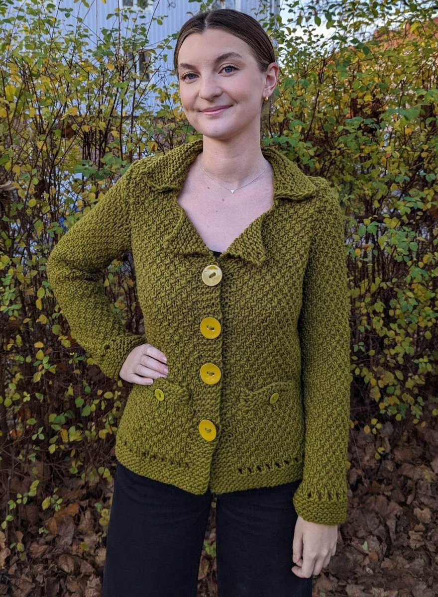 Jakke/cardigan strikket med dobbelt retstrik. Tøjet strikkes på traditionel vis i fire dele, der er syet sammen.