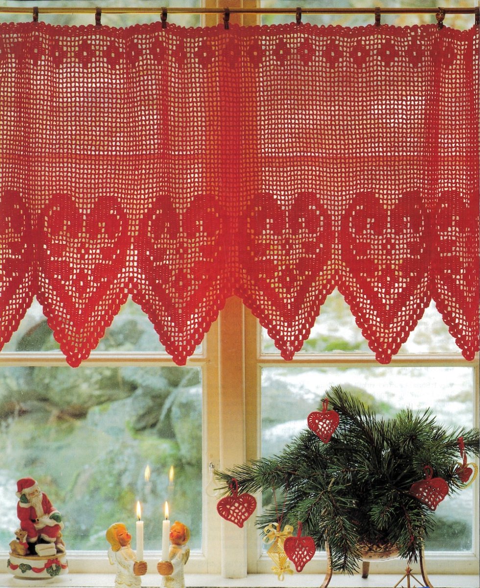 Gardinkappe hæklet efter mønstertekst. Små hjerter hæklet efter mønstertekst.