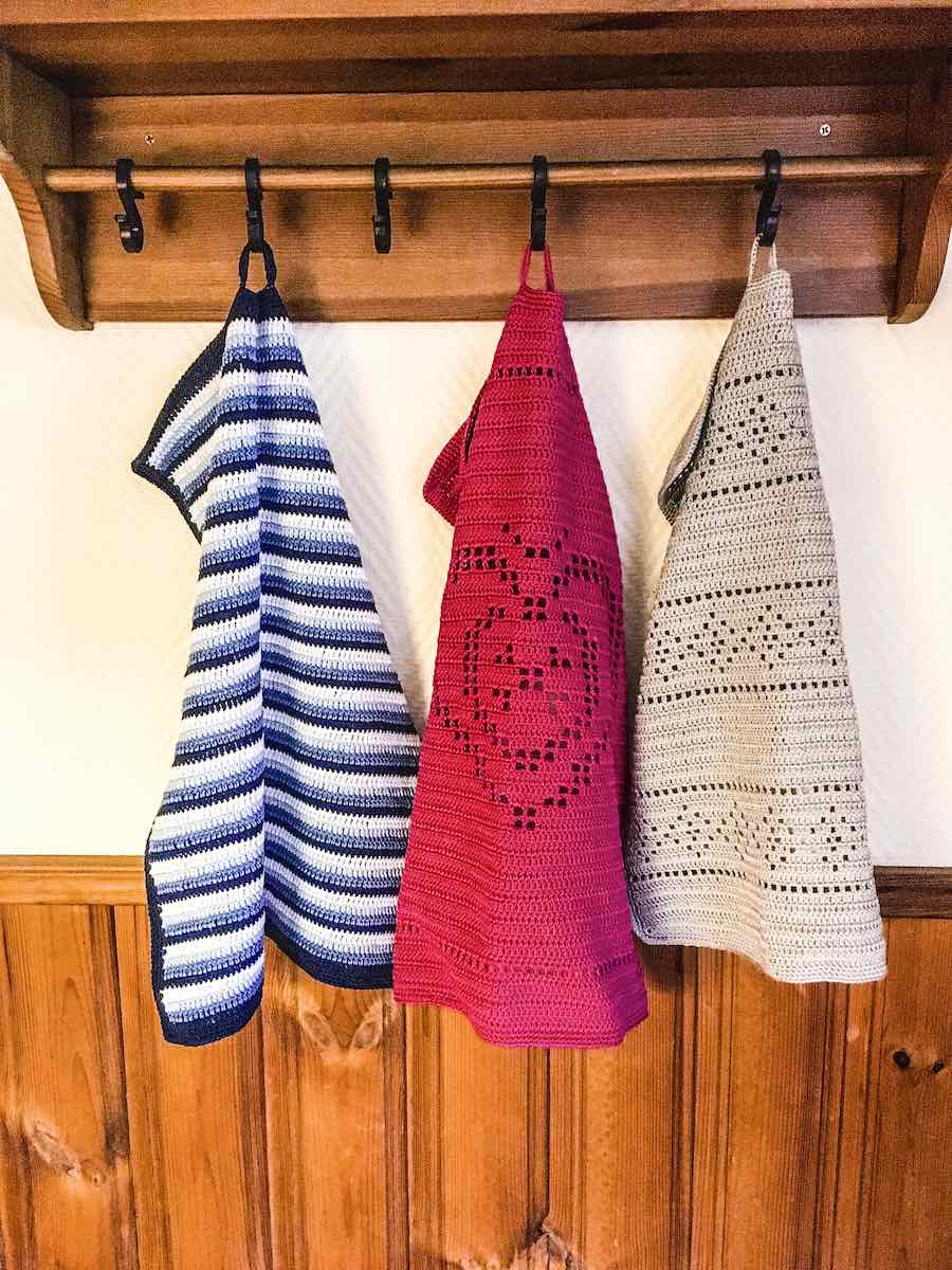 Håndklædet hækles i stangmasker med lige rækker af hulmasker og derefter et midtermønster, der følges fra diagrammet. Når højden er færdig, hækles der yderligere rækker af stangmasker, og håndklædet færdiggøres med en hæklet kant hele vejen rundt og en ophængsbøjle dannet af luftmasker og fastmasker.