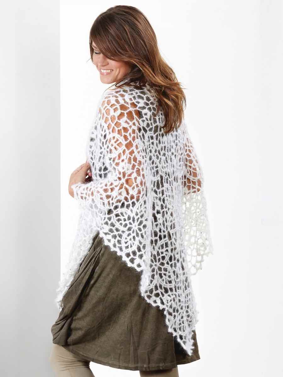 Dette elegante sjal er lavet af 15 hele firkanter og 6 halve firkanter, der er hæklet sammen en efter en for at skabe den karakteristiske trekantform. Hver firkant hækles i fem rækker med luftmasker, stangmasker og stangmasker sammen for at danne et dekorativt mønster. Når firkanterne er samlet, afsluttes arbejdet med en kant af fastmasker og dekorative picotmasker langs siderne.