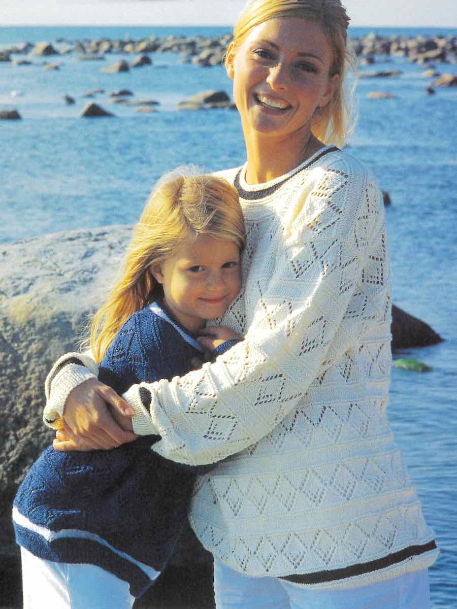 Strikket bluse. Start med rib, fortsæt mønsteret efter diagrammet med omslag og løse masker. Strik ryg, forstykke og ærmer separat, form til hals og skuldre, og sy delene sammen.