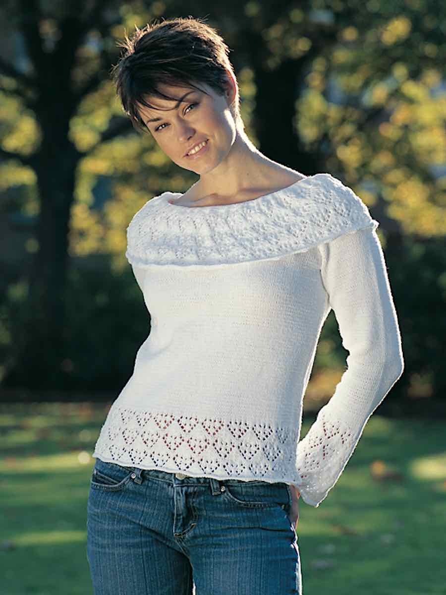 Strik en bomuldstrøje med hulmønsterkanter og hulmønsterkant efter diagrammet. Forstykke, rygstykke og ærmer strikkes separat i glatstrik og hulmønster, med formning ved ud- og indtagninger. Afslut med en bred strikket krave.