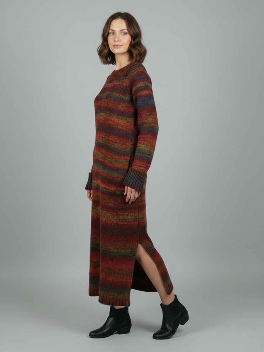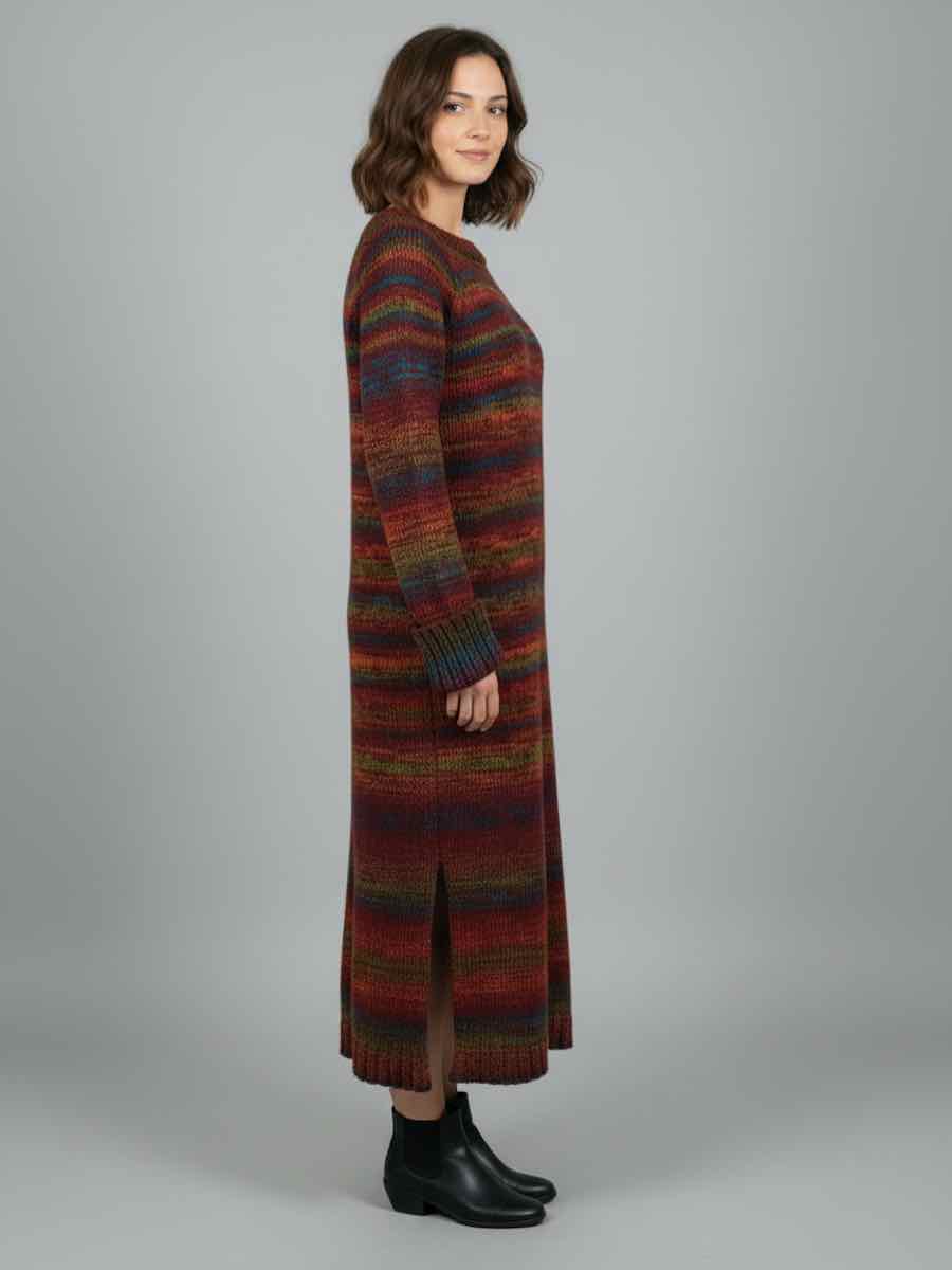 Kjolen strikkes ovenfra og ned i dobbelt garn. Start med rib ved halsen og fortsæt i glatstrik med raglanudtagninger efter markørerne. Del ærmerne til ryg- og forstykke, strik rundt til ønsket længde og afslut med rib og slids. Ærmerne strikkes separat med en foldet kant.