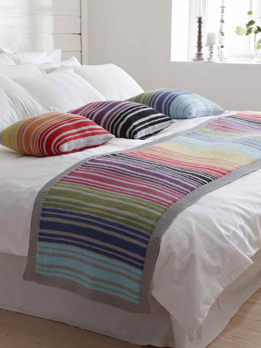 Pude og sengetæppe strikkes i striber med glatstrik og retstrik. Puden strikkes rundt på rundpind, sengetæppet strikkes fladt med kantmasker i retstrik.