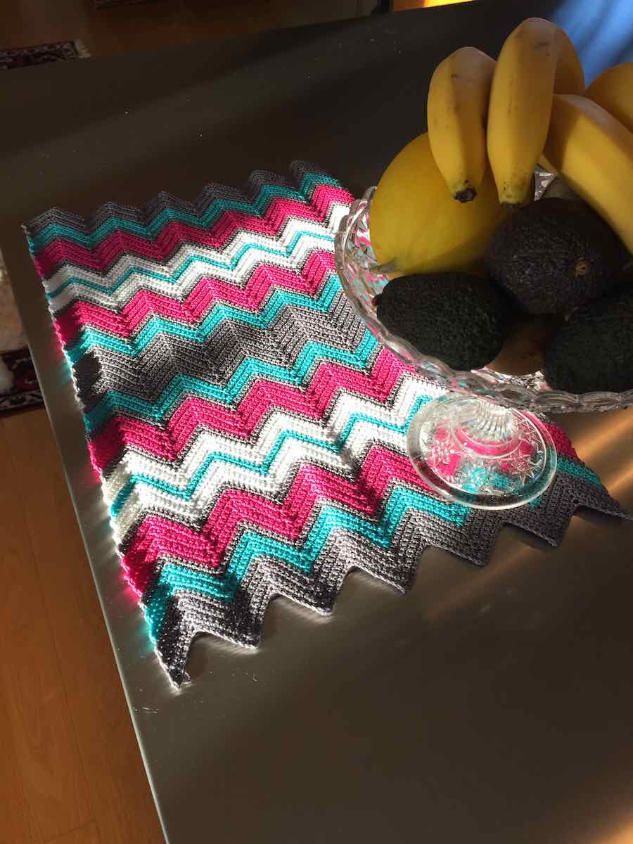 Puden og løberen hækles i et kilemønster af fastmasker, hvor ud- og indtagninger danner spidserne. Arbejdet bygges i farvestriber i den angivne rækkefølge og hækles frem og tilbage over samme rækketype.