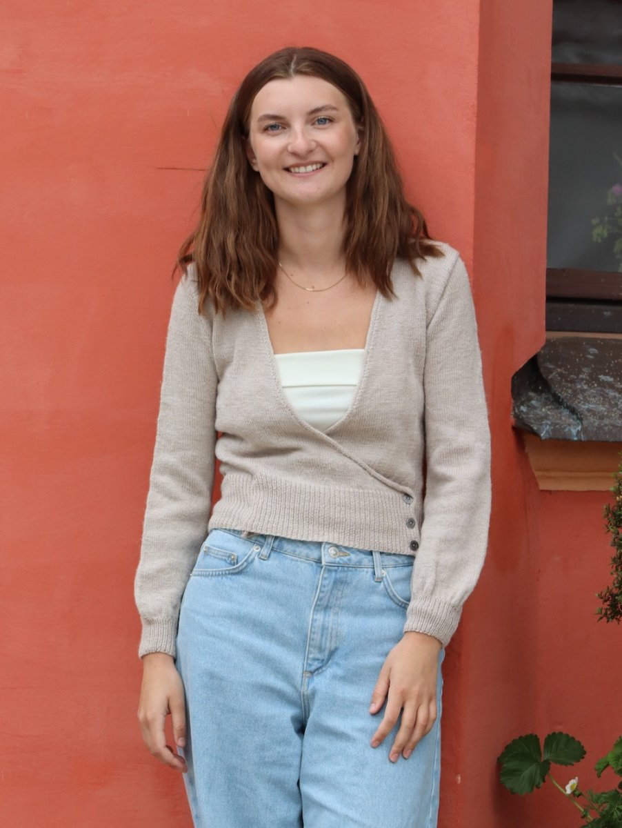 En wrap cardigan strikket nedefra og op. Cardiganens kant afsluttes med icord.