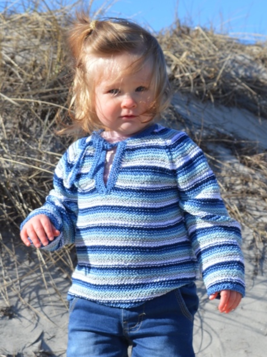 Denne stribede børnetrøje er strikket i flere dele med et blødt bomuldsgarn. Arbejdet udføres i retstrikning, hvilket giver en flot struktur og gør striberne tydelige. Du starter med ryg- og forstykket separat, hvor forstykket deles til en slids med snøring.