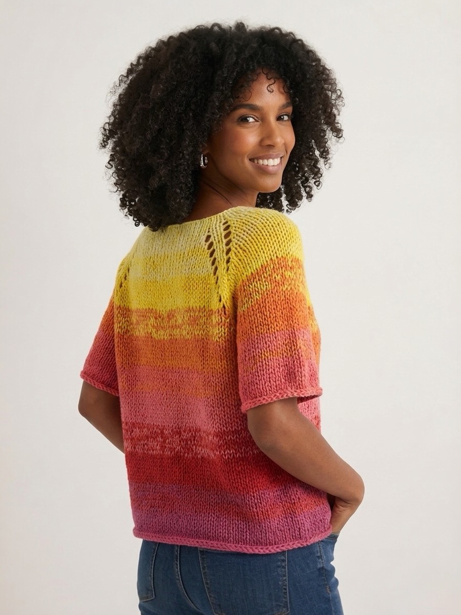 Trøjen har en afslappet pasform med dekorative raglanudtagninger og korte ærmer, perfekt til både hverdag og fest. Takket være de grove strikninger skrider arbejdet hurtigt frem.
