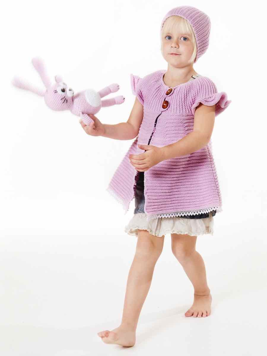 Frakken strikkes frem og tilbage i hævede striber med indtagninger. Stykkerne sys sammen, og et bærestykke strikkes separat og fastgøres øverst. Ærmerne har flæser, og halsen afsluttes med en hæklet kant. Huen strikkes i rib og formes ved indtagninger øverst.