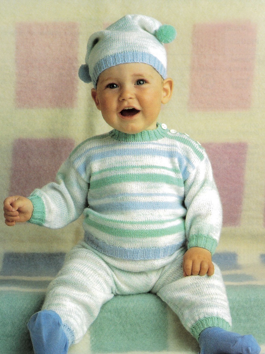 Tilbehør: 4 knapper til sweateren og ca. 60 cm elastik til bukserne.