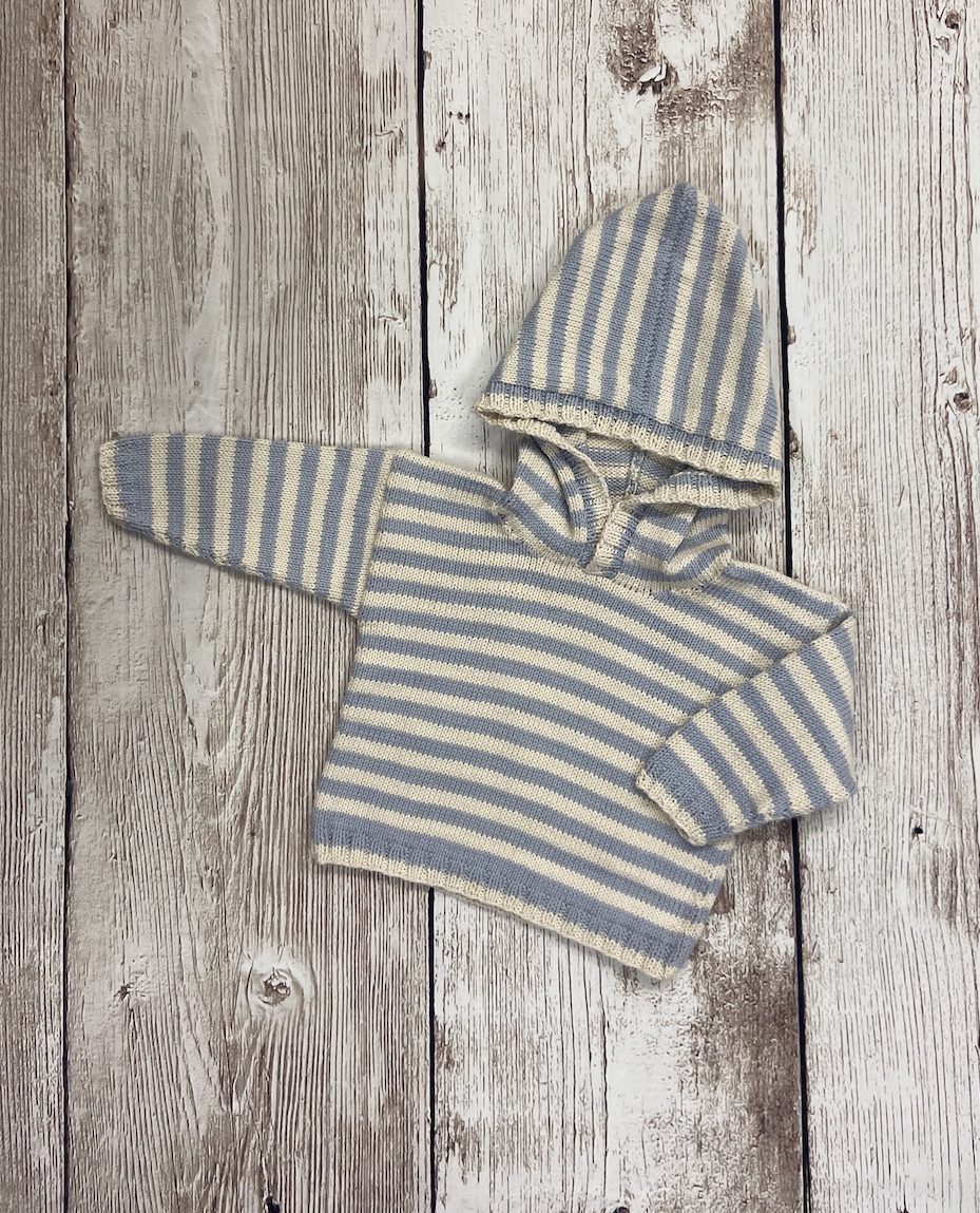 Hættetrøje til de hårde fyre. Strikket med 2 farver på traditionel vis i fire dele. Hætten er strikket fra halsen.