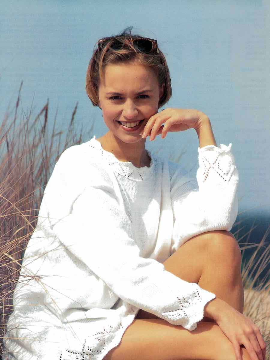 Bluse i hulstrikning med diagram. Strik for- og bagstykke med maskeindtagninger, ærmer og halsudskæring efter diagrammet.