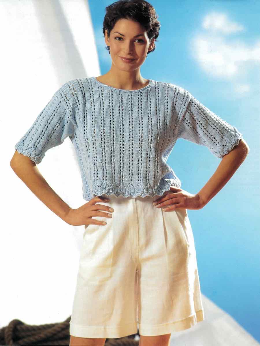 Blusen strikkes med for- og bagstykker med diagrammer og indtagninger til hals og ærmegab. Ærmerne strikkes separat og sys i. Halsudskæringen samles op og strikkes ret. Følg diagram A og B med ret- og vrangmasker og indtagninger.