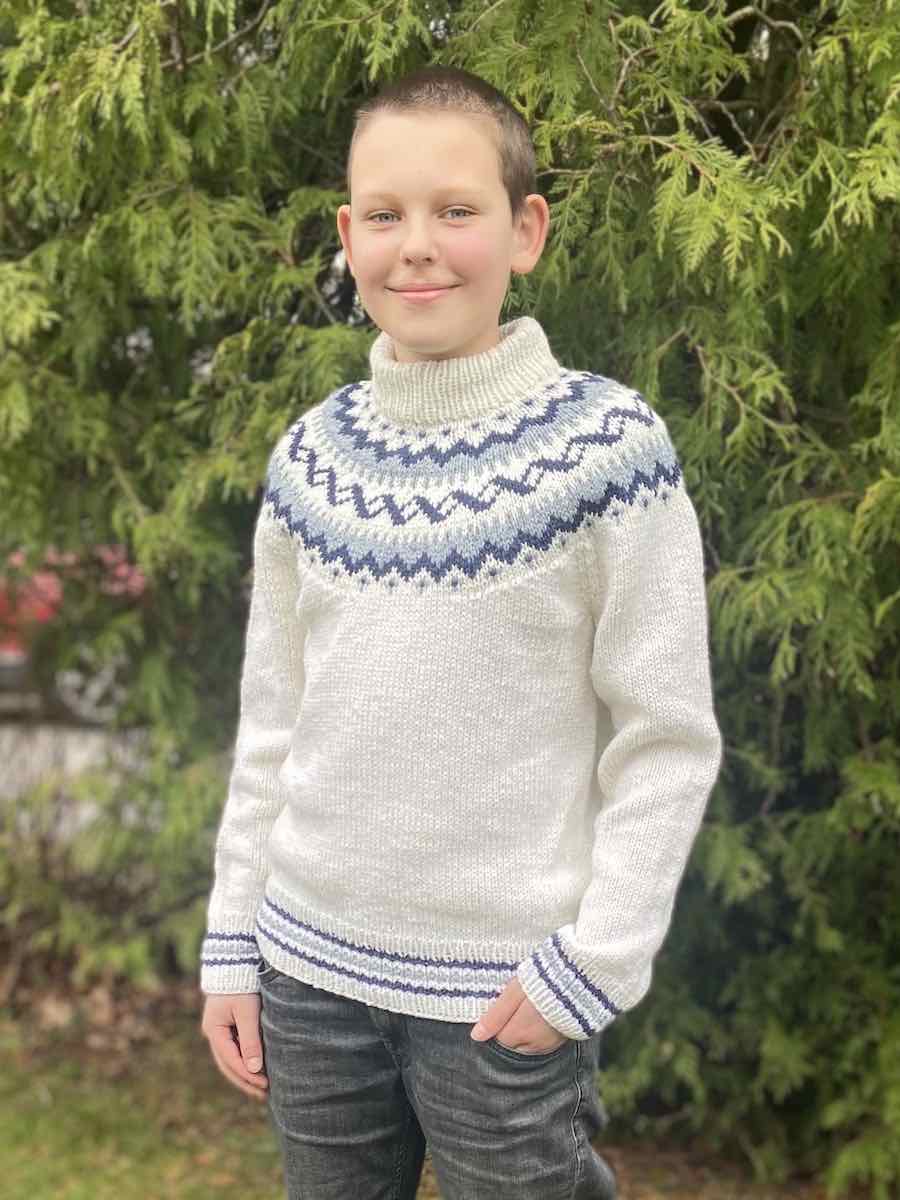 Børnetrøjen strikkes nedefra og op på rundpinde, ærmerne er ens. Den har raglan indersømme, før den samles til bærestykket.