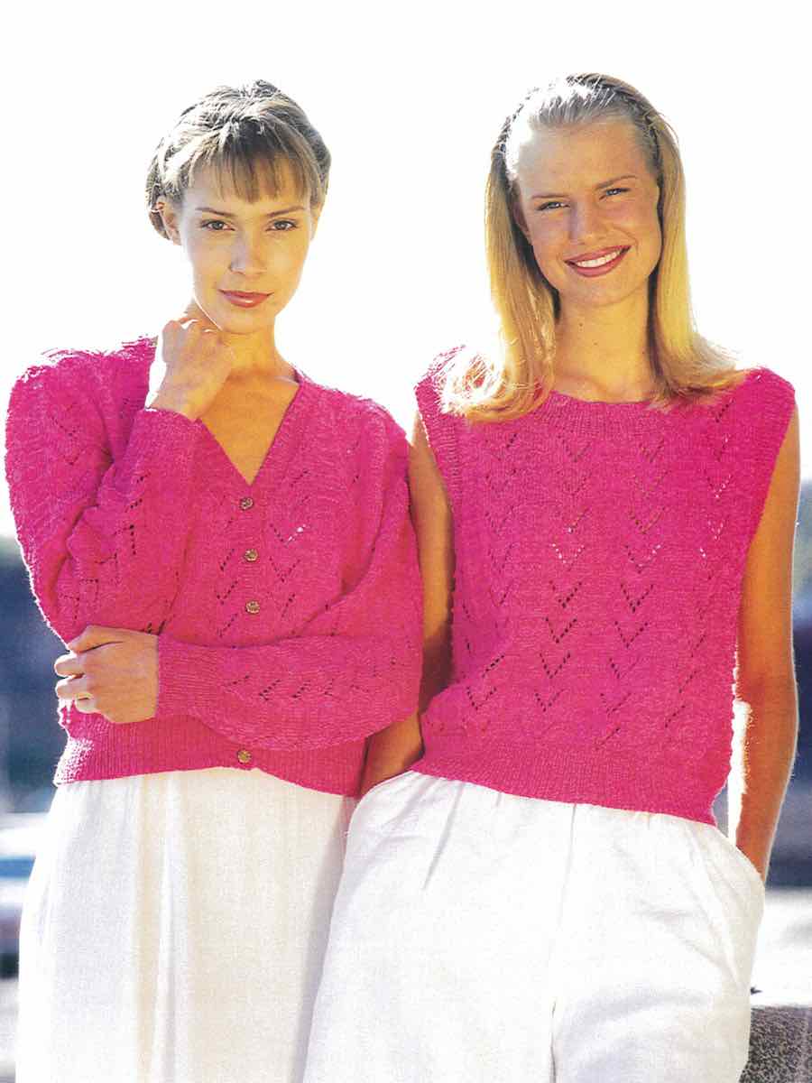 Cardiganen og toppen strikkes i et smukt hulmønster efter diagrammet. Ryg- og forstykket strikkes separat med formning til ærmegab og hals. Ærmerne strikkes separat i samme mønster.