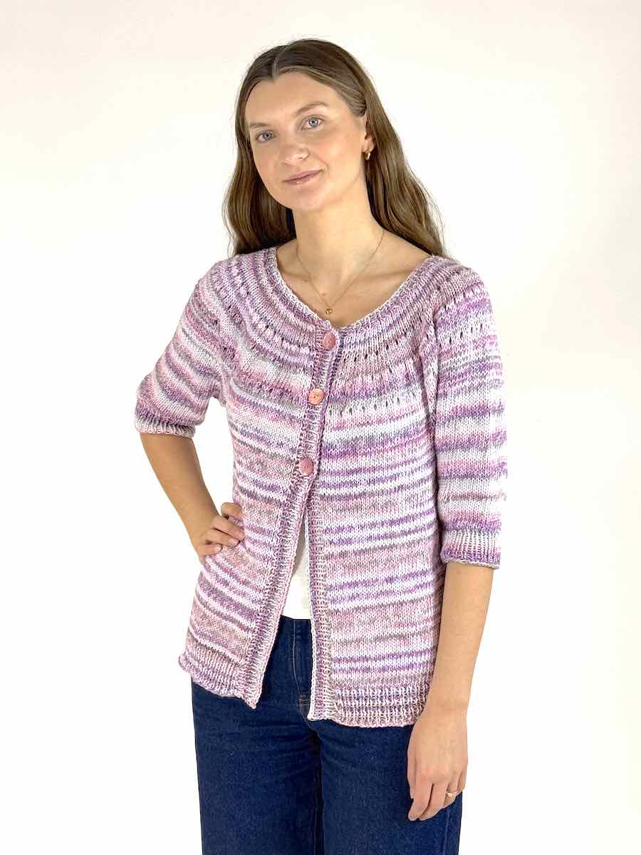 En cardigan, der strikkes oppefra og ned i ét stykke med trekvart ærmer.