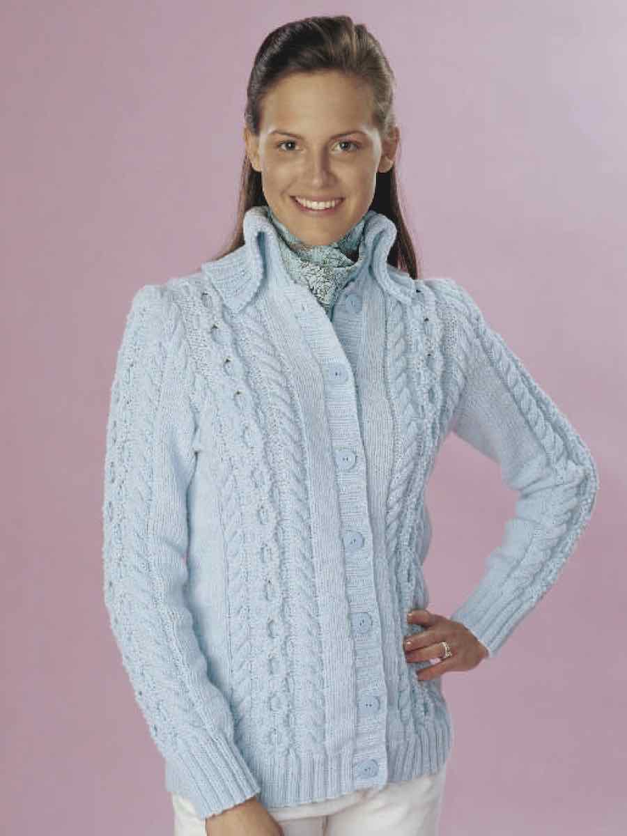 Cardigan med smukke fletninger. Strikning i dele nedefra og op med fletningsmønstre foran og på ærmerne. Formsydd med elastik, glatstrik og indtagninger. Afsluttet med elastiske kanter, krave og knapper for et klassisk look.