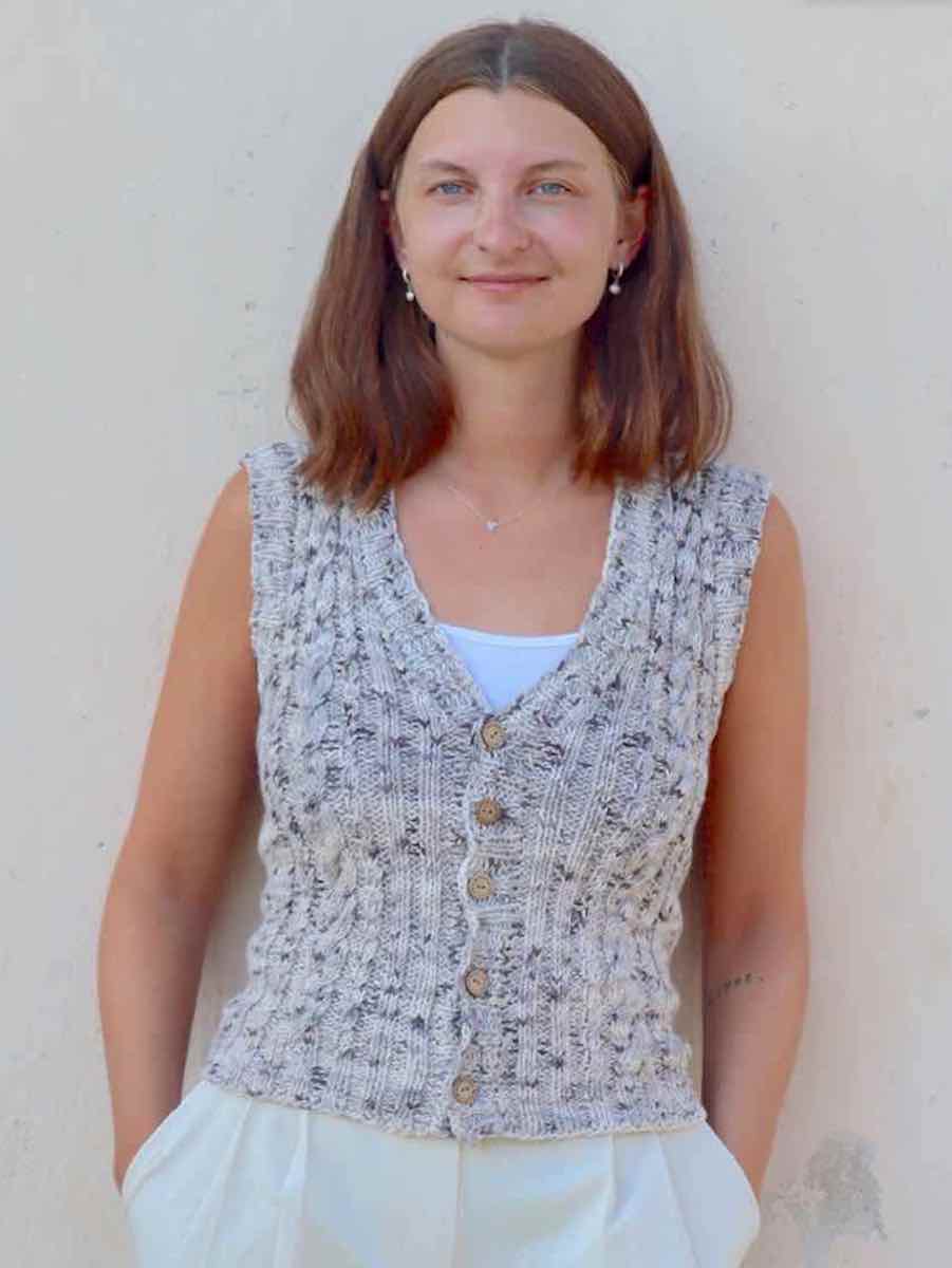 Vesten strikkes i ét stykke op til ærmegabet, derefter deles arbejdet i tre dele og hver side strikkes for sig.