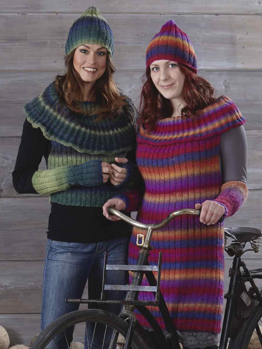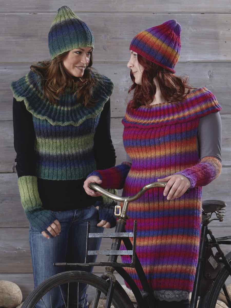 Tunika, top, hue og pulsvarmere strikkes i rib. Tøjet er formet med ud-/indtagninger og afsluttes med et bærestykke i rib og en glatstrikkant. Huen og pulsvarmerne strikkes rundt og er nemme at samle.