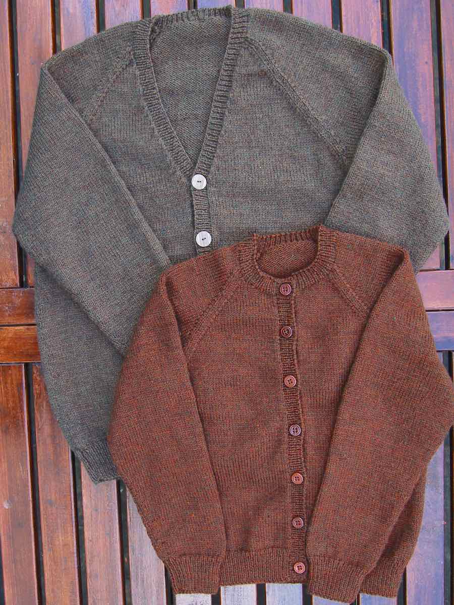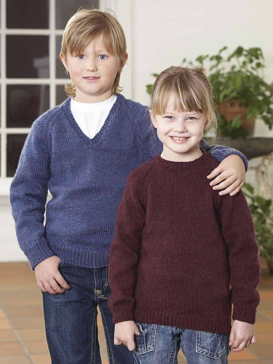 Ensfarvede raglan-trøjer og cardigans til hele familien i blød Carolina – vælg rund hals eller v-hals. Tøjet strikkes nedefra og op, med raglanindtagninger og ribkanter. Fås i størrelser fra børn til voksne, både kvinder og mænd.