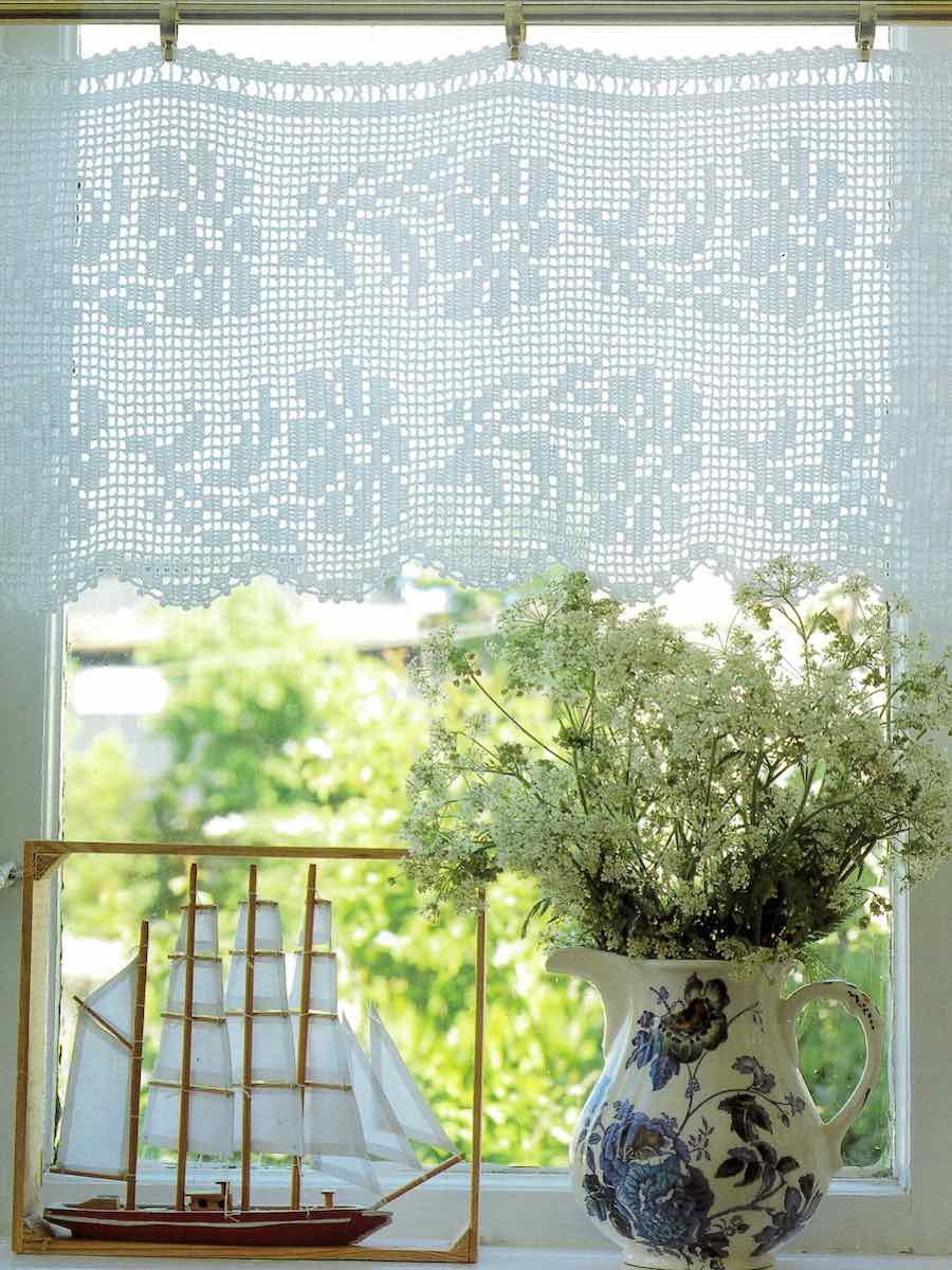 Hækl en gardinstang med blomstermønster i merceriseret bomuld. Følg diagrammet med stangmasker og luftmasker. Afslut med en kappekant.