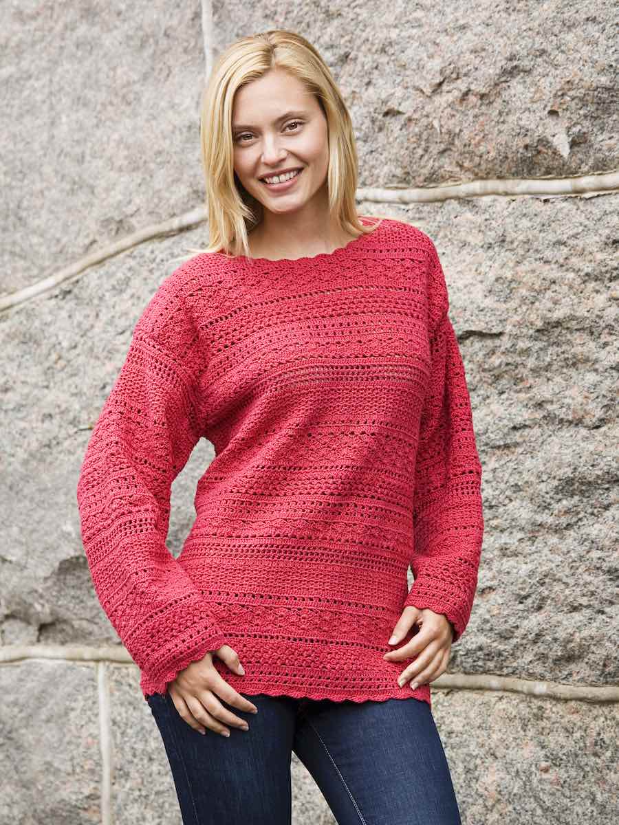 Blusen hækles i flere forskellige mønstre, der gentages i et stribet mønster. For- og bagstykket dannes ved at tage masker ind ved ærmegab og hals, mens ærmerne hækles med udtagninger langs siderne. Stykkerne blokeres, syes sammen og afsluttes med hæklede st-grupper rundt om hals, bund og ærmer.
