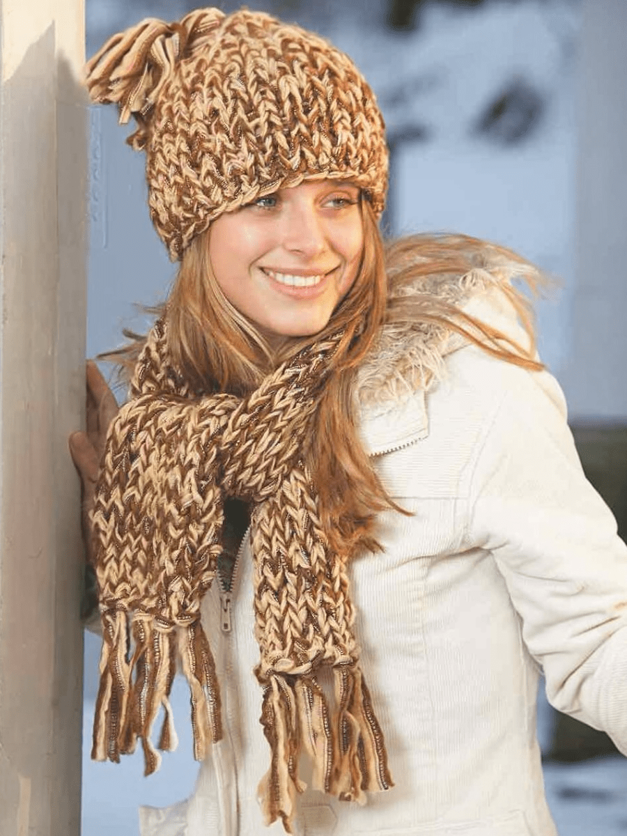 Huen og halstørklædet strikkes med meget grove pinde i glatstrik, hvilket giver et blødt og luftigt resultat. Huen er formet med indtagninger øverst og afsluttes med en stor kvast, mens halstørklædet strikkes lige og har frynser i enderne.