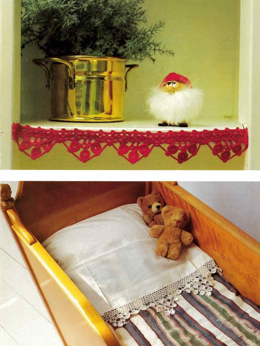 Hækl en charmerende hyldestrimmel og kappeblonde i merceriseret bomuld. Mønsteret indeholder picots, stangmaskegrupper og hæklede blomster, der fastgøres bagefter.