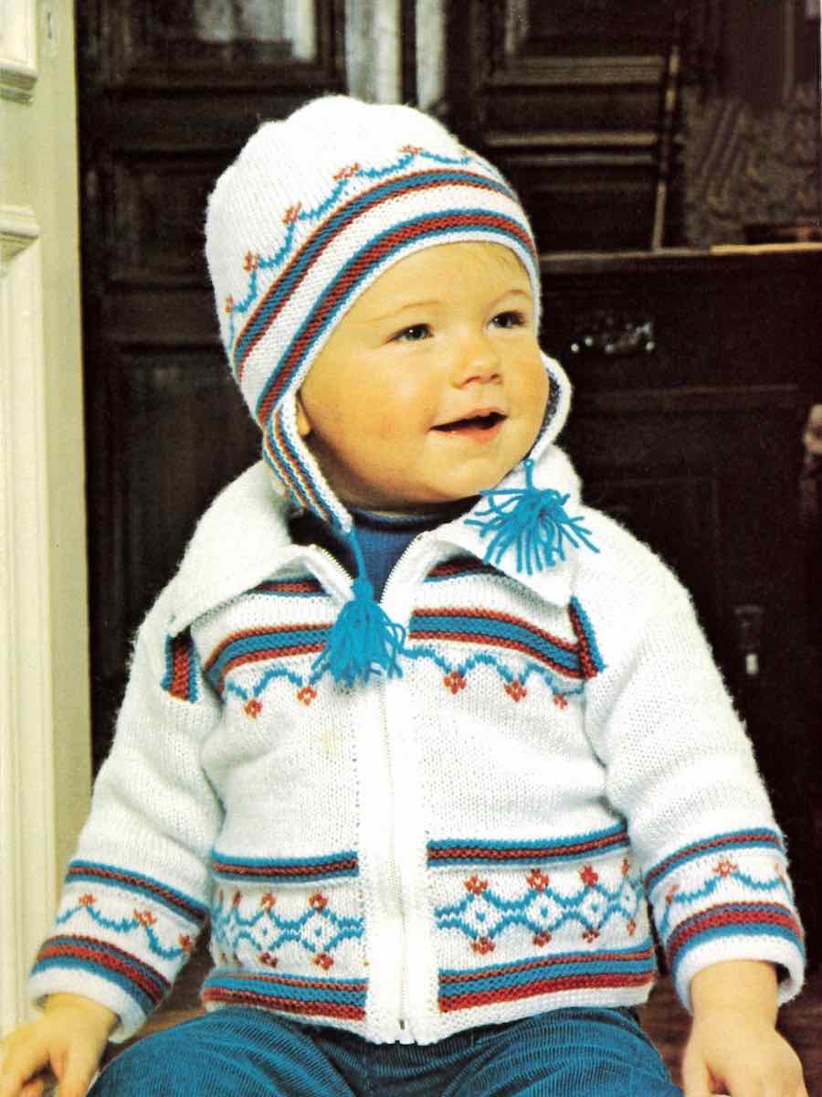 Sæt i Piggelen garn med jakke, hue og øreklapper. Tøjet strikkes nedefra og op med et struktureret mønster i henhold til diagrammet. Jakken er strikket med raglanindtagninger og knapkant, huen er formet med indtagninger, øreklapperne er strikket separat og syet på.