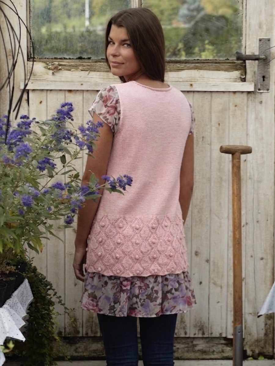 Toppen strikkes frem og tilbage med en midterdel i mønster efter diagrammet og glatstrik i siderne. Maskerne tages gradvist ind for at få formen i siderne og ved ærmegabet. Halskant og slids afsluttes med fastmaskekanter og en knap. Ærmegabene samles op og strikkes i retstrik.