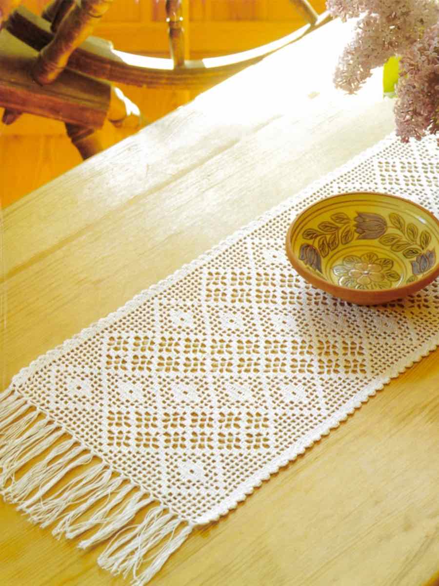 Løberen er lavet med luftmasker, dobbeltmasker og dobbeltmasker i et gentagende diagonalt mønster.