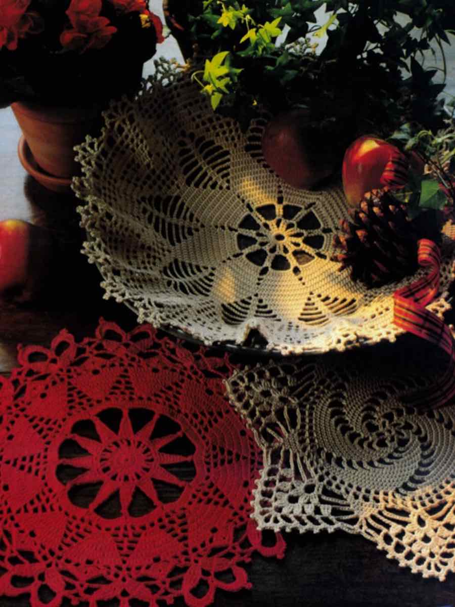 Rund dug hæklet fra midten og udad med luftmasker, dobbeltmasker og picotmasker, der skaber en spiralformet struktur. Hver omgang bygger videre på den forrige med udtagninger, der skaber en snurreeffekt. Resultatet er en dekorativ lille dug med et elegant hulmønster.