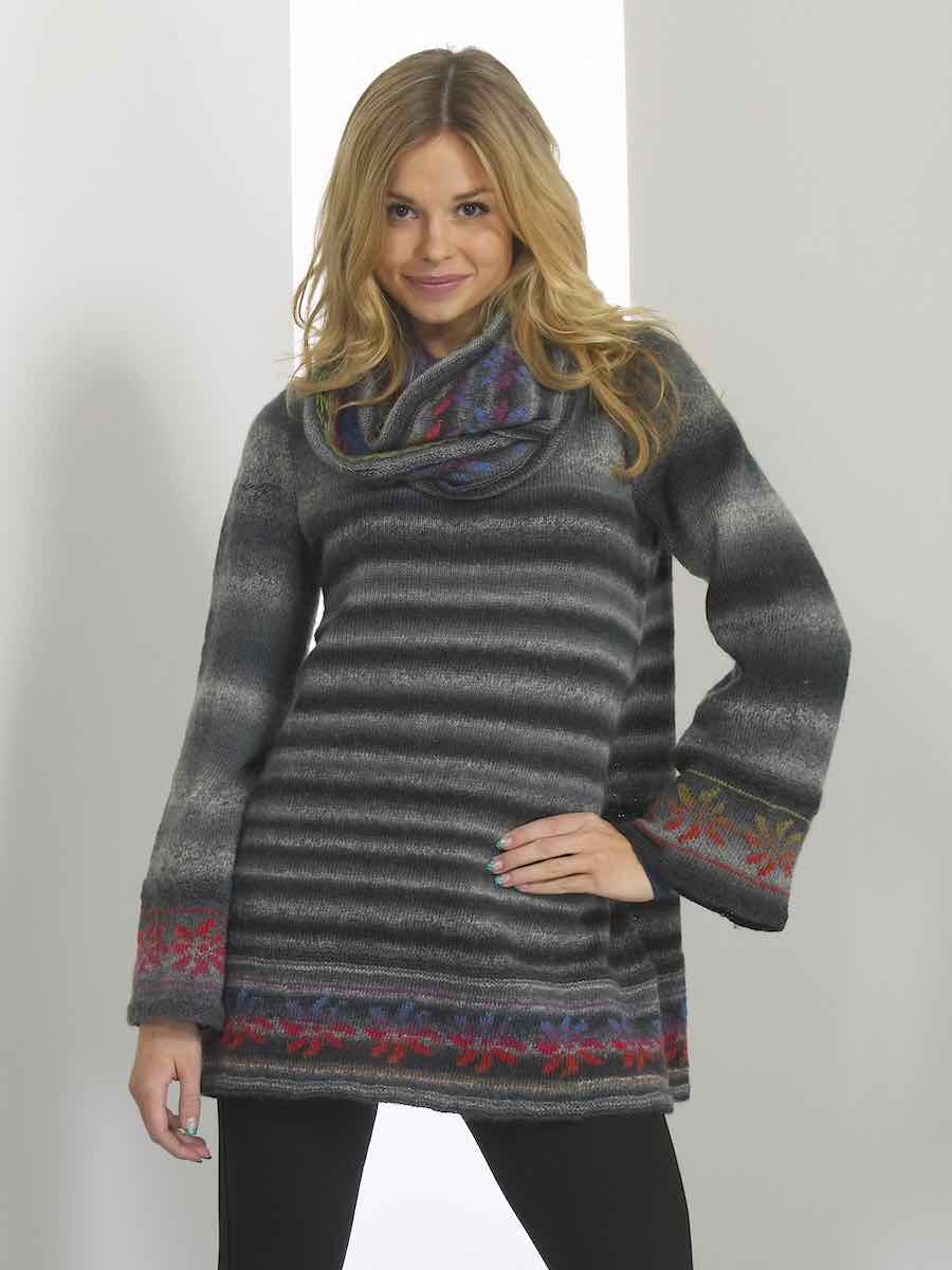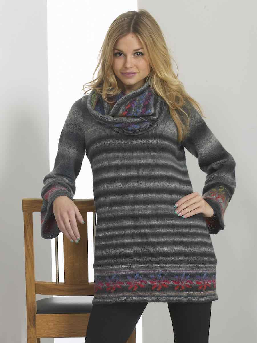 Tunikaen strikkes rundt op til ærmegabene, derefter strikkes for- og bagstykket separat med en mønsterkant. Luk hals og skuldre af med afmaskninger, sy skuldrene sammen og sy ærmerne fast. Halsedissen strikkes rundt i rib og mønster.