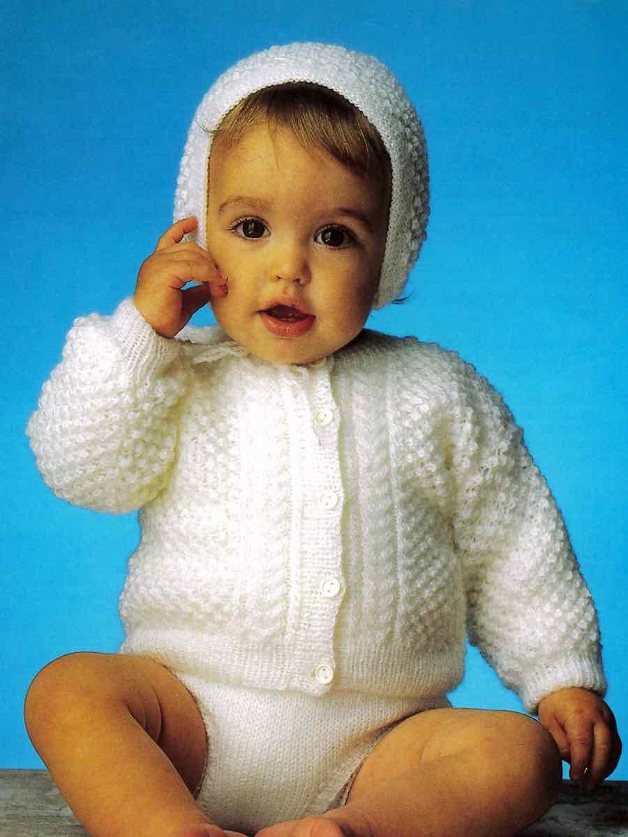 Cardigan, bukser og hue med snoningsmønster. Cardiganen strikkes i sektioner med snoninger efter diagrammet. Bukserne strikkes rundt fra skaftet og opefter. Huen strikkes i glatstrik fra rib. Alle dele samles og afsluttes med knapper.