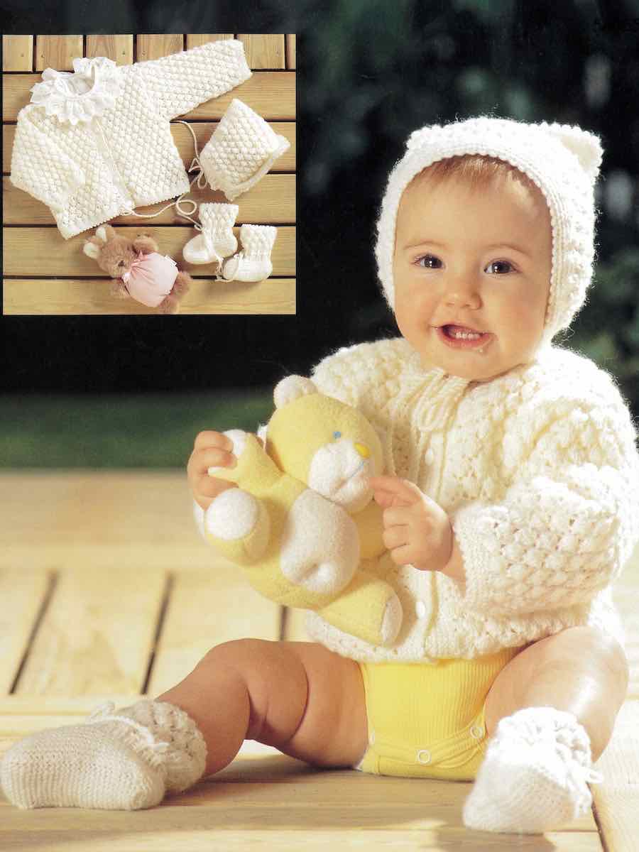 Strik en sød babycardigan med matchende hue og sokker i blød merinould! Tøjet strikkes frem og tilbage i sektioner med hulmønster, udtagninger og indtagninger. Cardiganen har en knaplukning, huen har en hæklet kant, og sokkerne har formsydde hæle og tæer.