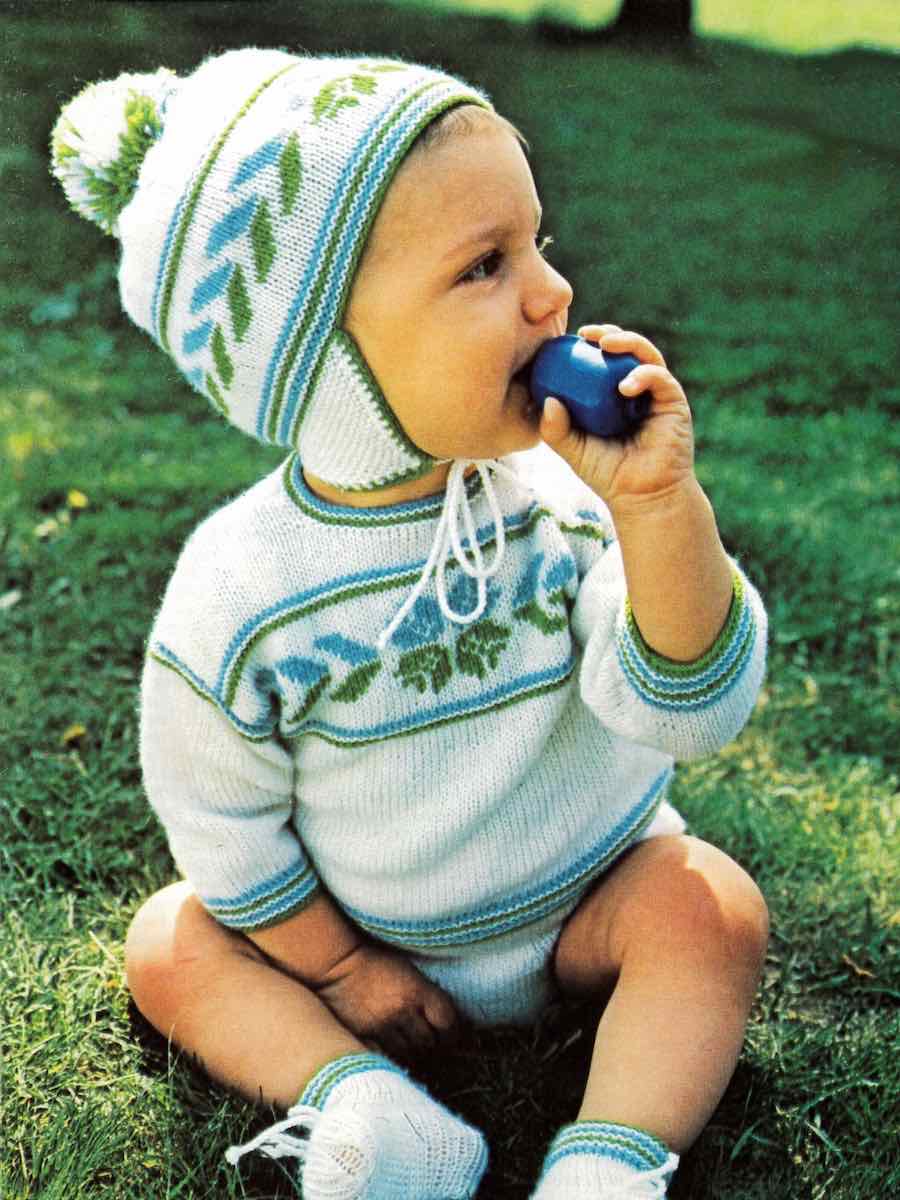 Sæt med sweater, bukser, hue og sokker i Piggelen garn. Tøjet strikkes nedefra og op med ribkanter og raglanindtagninger. Trøjen har en knaplukning, bukserne har elastik i taljen, huen er strikket nedefra, og sokkerne er i glatstrikning med en formsydd hæl og tå.