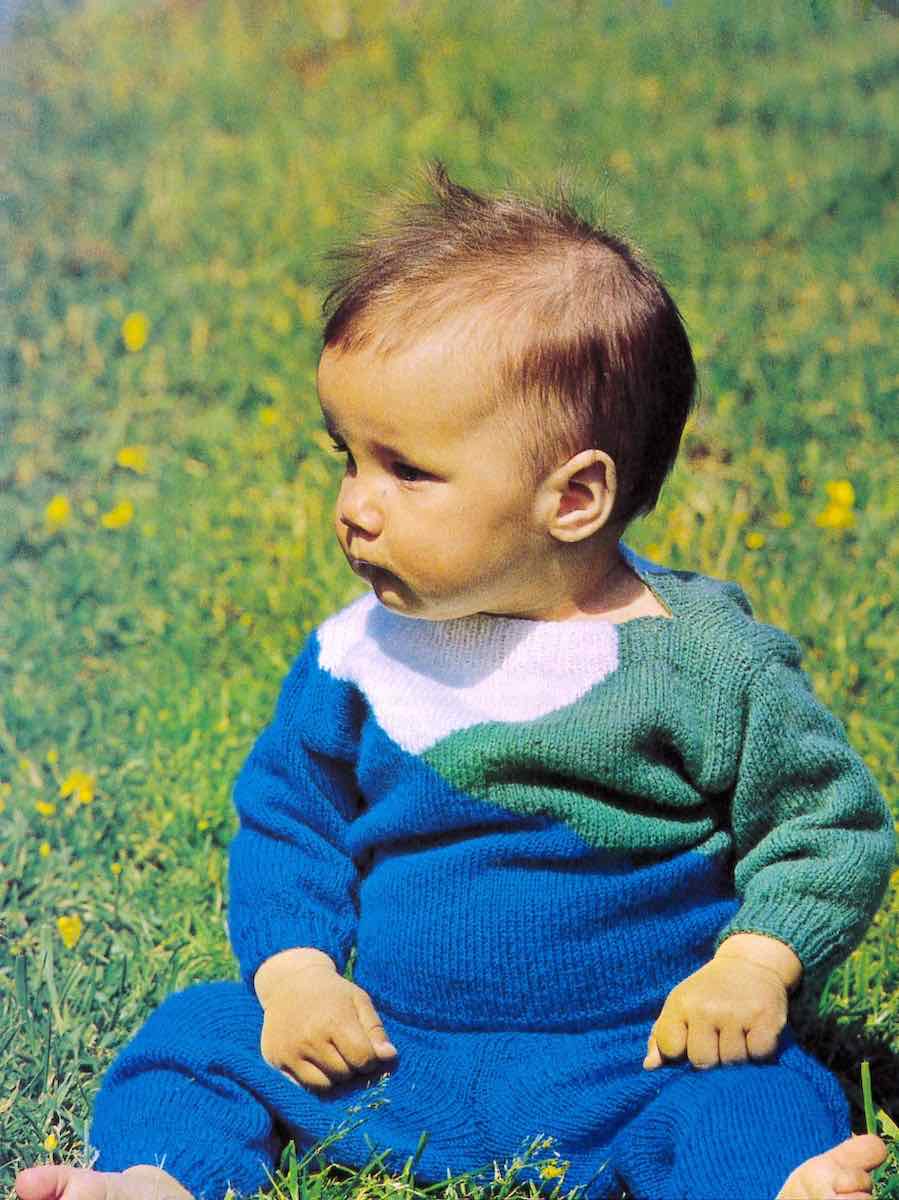 Sæt med sweater og bukser i et stilfuldt diagonalt design. Sweateren er strikket nedefra og op med intarsia-diagrammer i to farver og raglanærmer. Bukserne er strikket med elastik i taljen, benene går fra taljen og ned, med indslidninger for en god pasform.