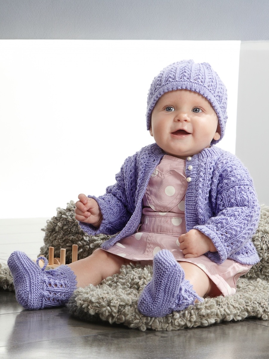 Et romantisk sæt med en blondestrikket cardigan , tanktop , hue og sokker . Cardiganen får sin karakter fra et dekorativt grafisk mønster og elegant blondearbejde langs kanterne. Den lukkes med tre knapper og har en klassisk pasform.