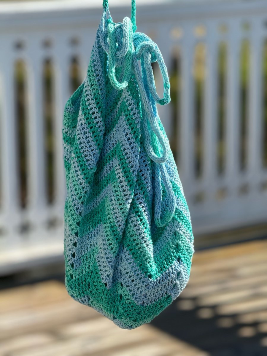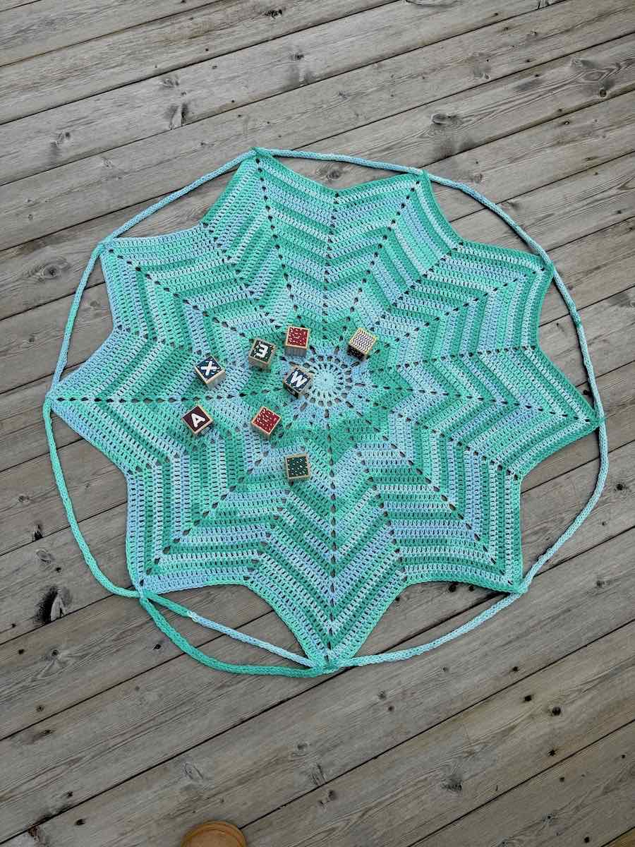 Hæklet babytæppe i stjernemønster, der kan bruges som taske til fx legetøj. Et bånd omkring tasken gør den let at stramme og lukke.