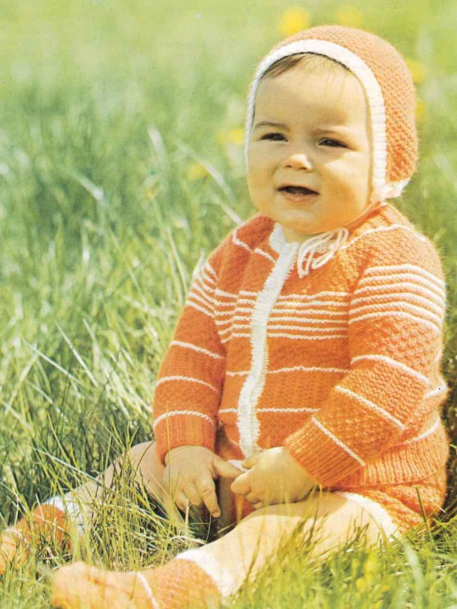 Cardigan, bukser og hue i Piggelen er strikket i flerfarvede mønstre. Cardiganen strikkes nedefra og op med isyede ærmer og raglanindtagninger. Bukserne er strikket med en kile og elastik i talje og ben. Huen strikkes rundt, tages ind øverst og sys sammen.