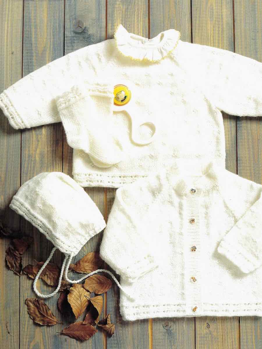 Cardigan, sweater, hue og sokker. Cardiganen strikkes i ét stykke med knaplukning. Sweateren har raglanærmer og strikkes ovenfra og ned. Hue og sokker strikkes rundt efter diagrammet.