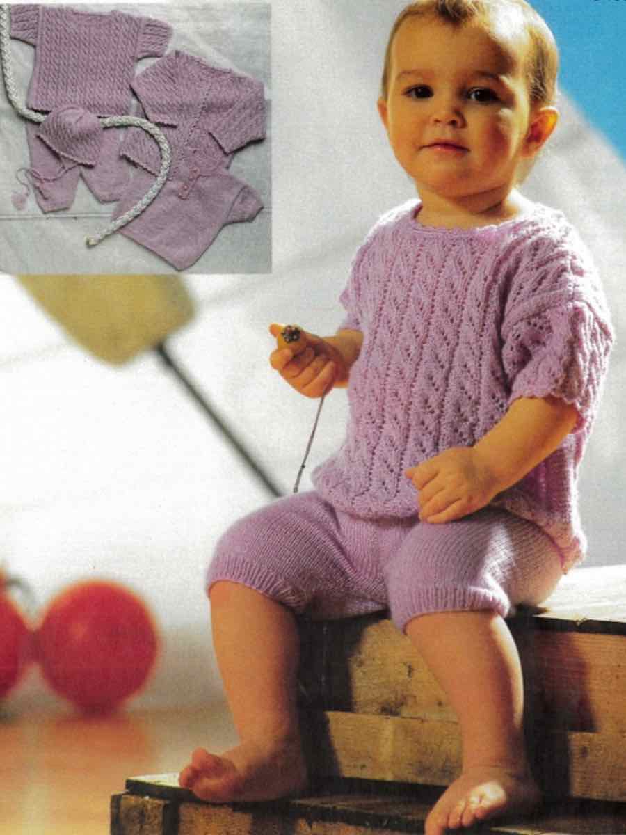 Sættet bestående af cardigan, bluse, T-shirt, bukser og hue strikkes i retstrik med enkle ud- og indtagninger. Flere dele strikkes lige, andre med rib og enkle mønsterindsatser.