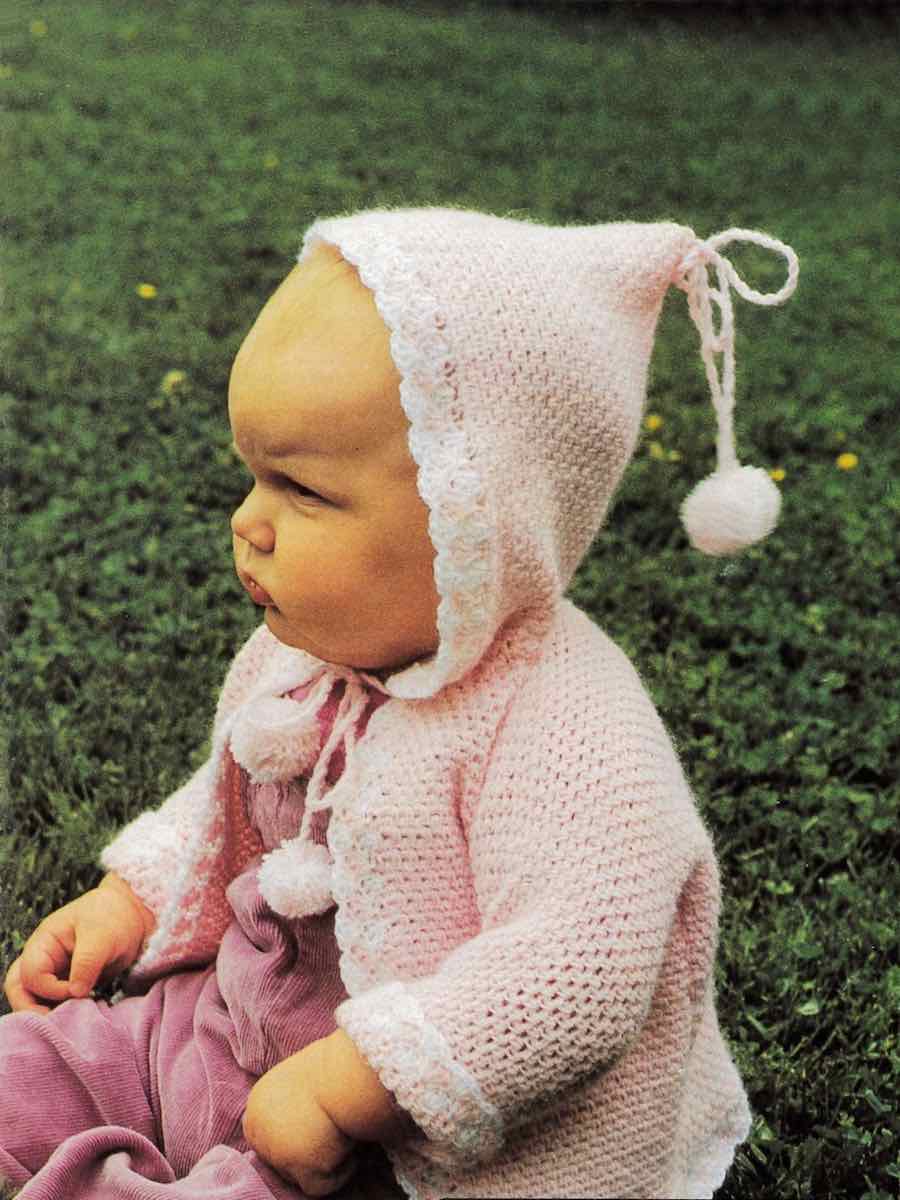 Et hæklet sæt med jakke og hætte i et flot strukturmønster. Jakken hækles i stykker nedefra og op, ærmerne hækles separat. Hætten hækles i ét stykke og sys på. Kuglesnører er fastgjort øverst for en sød finish.